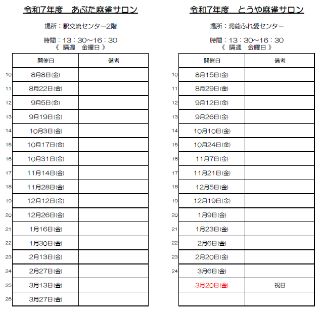 ◎令和7年度開催予定日 ●4/ 8(火) ●10/14(火) ●5/13(火) ●11/11(火) ●6/10(火) ●12/ 9(火) ●7/ 8(火) ● 1/13(火) ●8/ 5(火) ● 2/10(火) ●9/ 9(火) ● 3/10(火) |